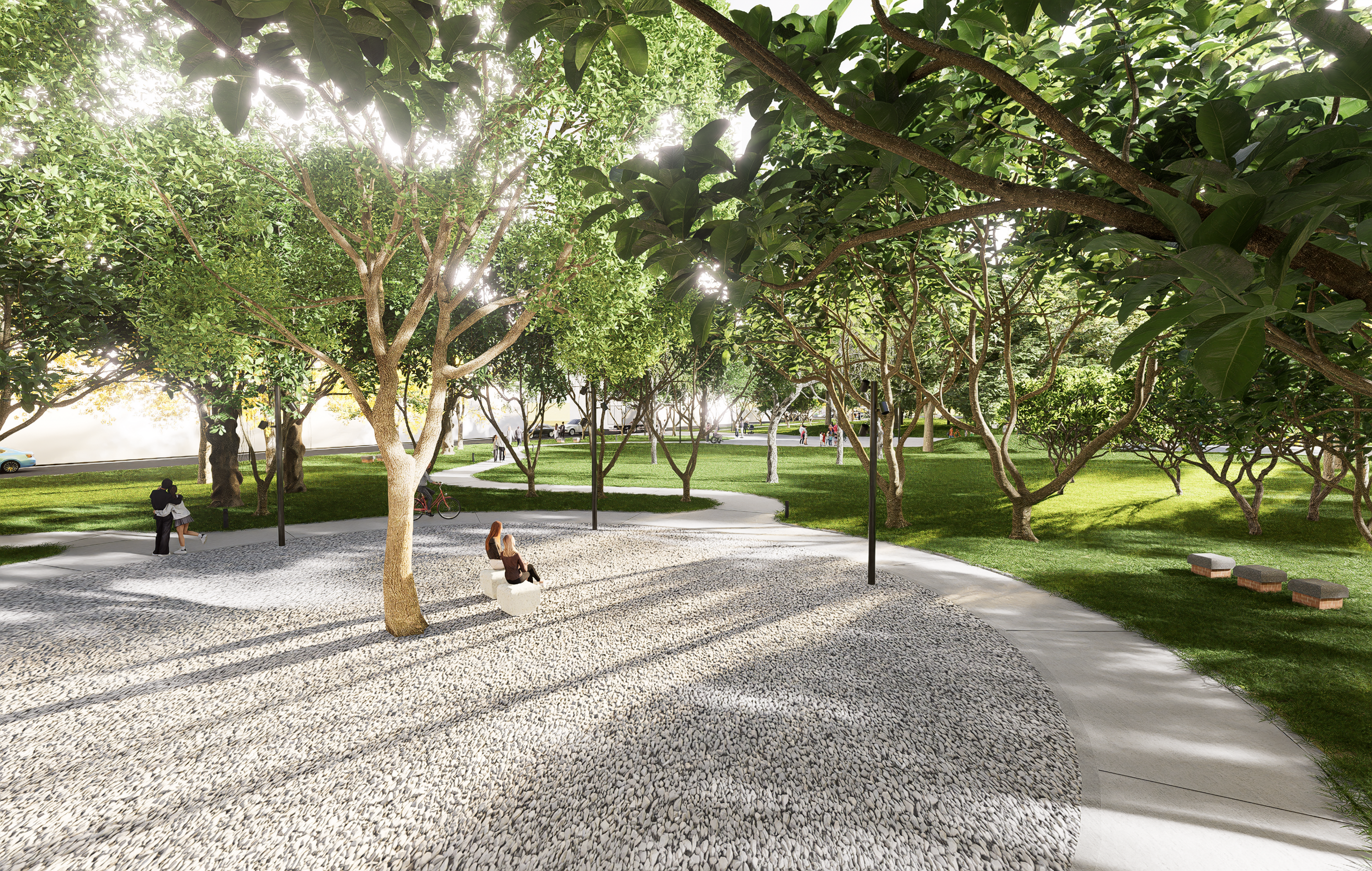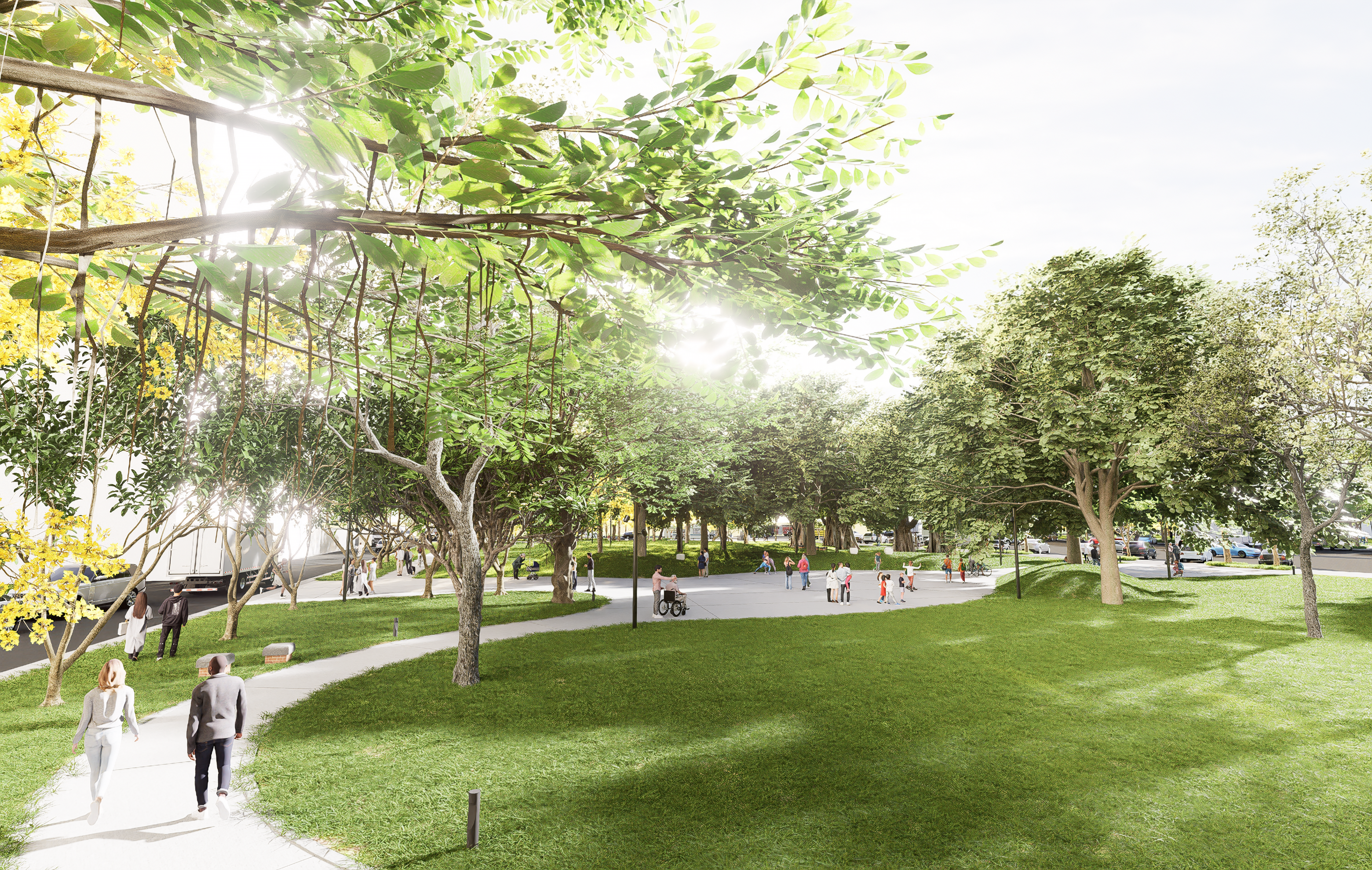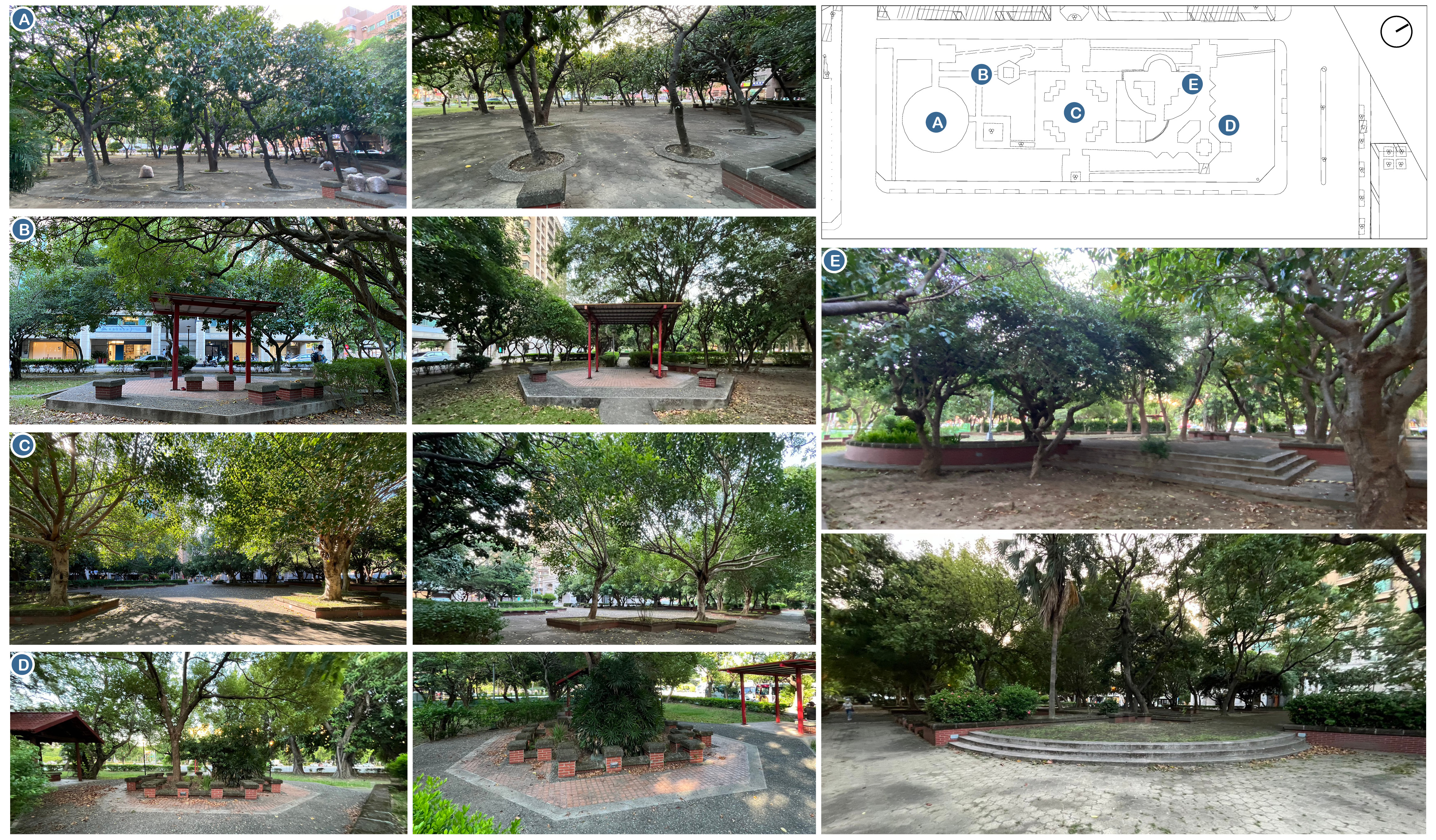 竹北市市西森林公園減量設計 市西公園改善前現況地坪高低不平/設施老舊散佈公園各處/對行動不便者不友善/喬木密集自然光線不易穿透/空間灰暗中央森林廣場草皮北側入口空間01北側入口空間02中央森林廣場大葉欖仁圓形林下空間